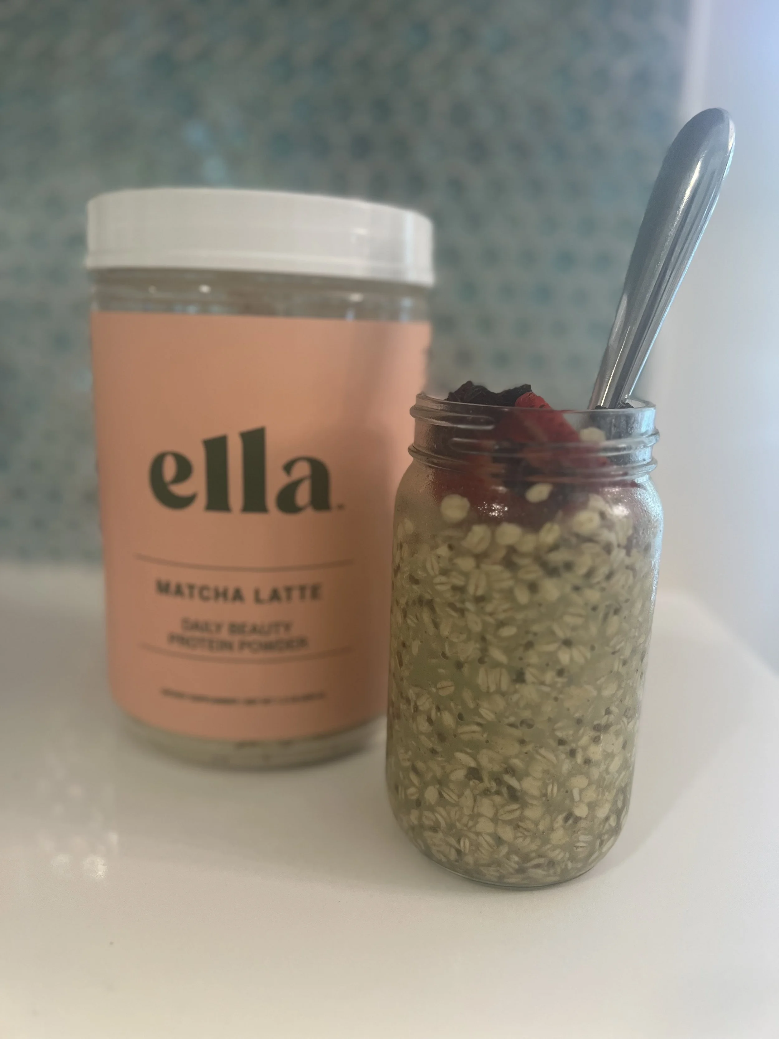Including a protein powder in my diet like Ella Matcha Latte Daily Beauty Protein Powder is simple to do if you are a fan of smoothies (just add two scoops to your concoction) or powders that are blended with water (combine two scoops with 8-12 ounces of cold water). But if you want something with some more staying-power, my overnight oats recipe will fit the bill.